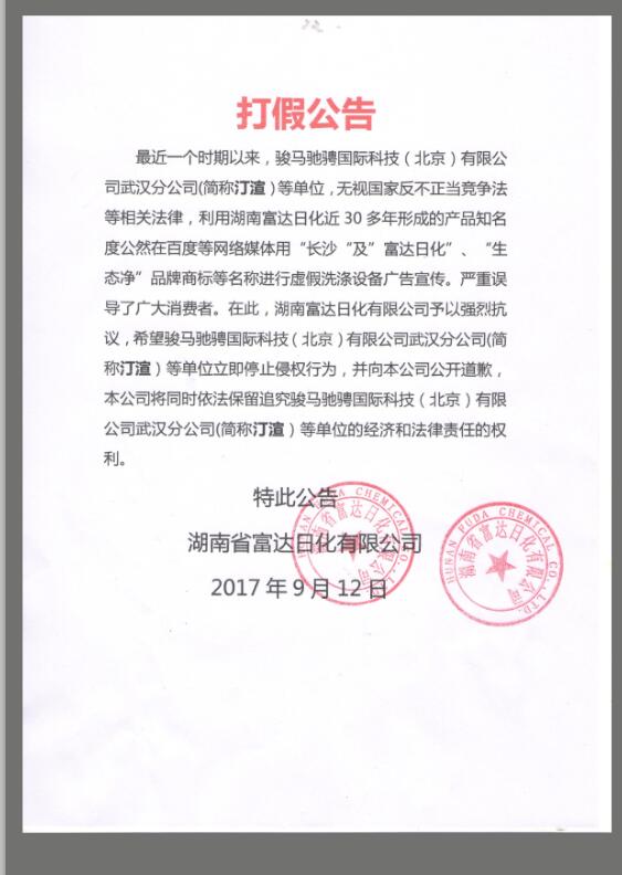 最近一個(gè)時(shí)期以來,以駿馬馳騁國際科技(北京)有限公司武漢分公司(簡稱汀渲)為代表等單位,無視國家反不正當(dāng)競爭法等相關(guān)法律,利用湖南富達(dá)日化近30多年形成的產(chǎn)品知名度公然在百度等網(wǎng)絡(luò)媒體用“長沙“及”富達(dá)日化”、“生態(tài)凈”品牌商標(biāo)等名稱進(jìn)行虛假洗滌設(shè)備廣告宣傳。嚴(yán)重誤導(dǎo)了廣大消費(fèi)者。在此,湖南富達(dá)日化有限公司予以強(qiáng)烈抗議,希望駿馬馳騁國際科技(北京)有限公司武漢分公司(簡稱汀渲)等單位立即停止侵權(quán)行為,并向本公司公開道歉,本公司將同時(shí)依法保留追究駿馬馳騁國際科技(北京)有限公司武漢分公司(簡稱汀渲)等單位的經(jīng)濟(jì)和法律責(zé)任的權(quán)利。
