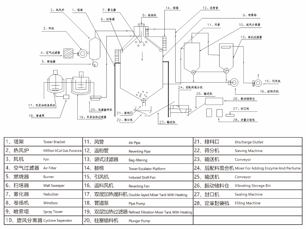干燥塔(干燥塔體、塔承載加強(qiáng)圈、骨架、熱風(fēng)分布器、人孔檢修門(mén)、出風(fēng)管及清洗人孔、錐體氣錘、主塔支撐鋼架、進(jìn)塔熱風(fēng)管道、變徑連接管道、保溫材料、伴熱攪拌罐、電加熱、過(guò)濾器)、熱源系統(tǒng)(燃?xì)鉄犸L(fēng)爐)、鼓風(fēng)機(jī)(鼓風(fēng)機(jī)、初/中效空氣過(guò)濾器)、進(jìn)料泵、噴槍、高效旋風(fēng)分離器(高效旋風(fēng)分離器、旋風(fēng)出料閥、緩存料倉(cāng))、除塵系統(tǒng)(管道、布袋除塵器)、引風(fēng)機(jī)、控制系統(tǒng)(控制柜、變頻器、溫度傳感器、壓力傳感器)、輔助系統(tǒng)(欄桿、扶梯、現(xiàn)場(chǎng)電線電纜橋架、現(xiàn)場(chǎng)鋼架結(jié)構(gòu)平臺(tái)) |